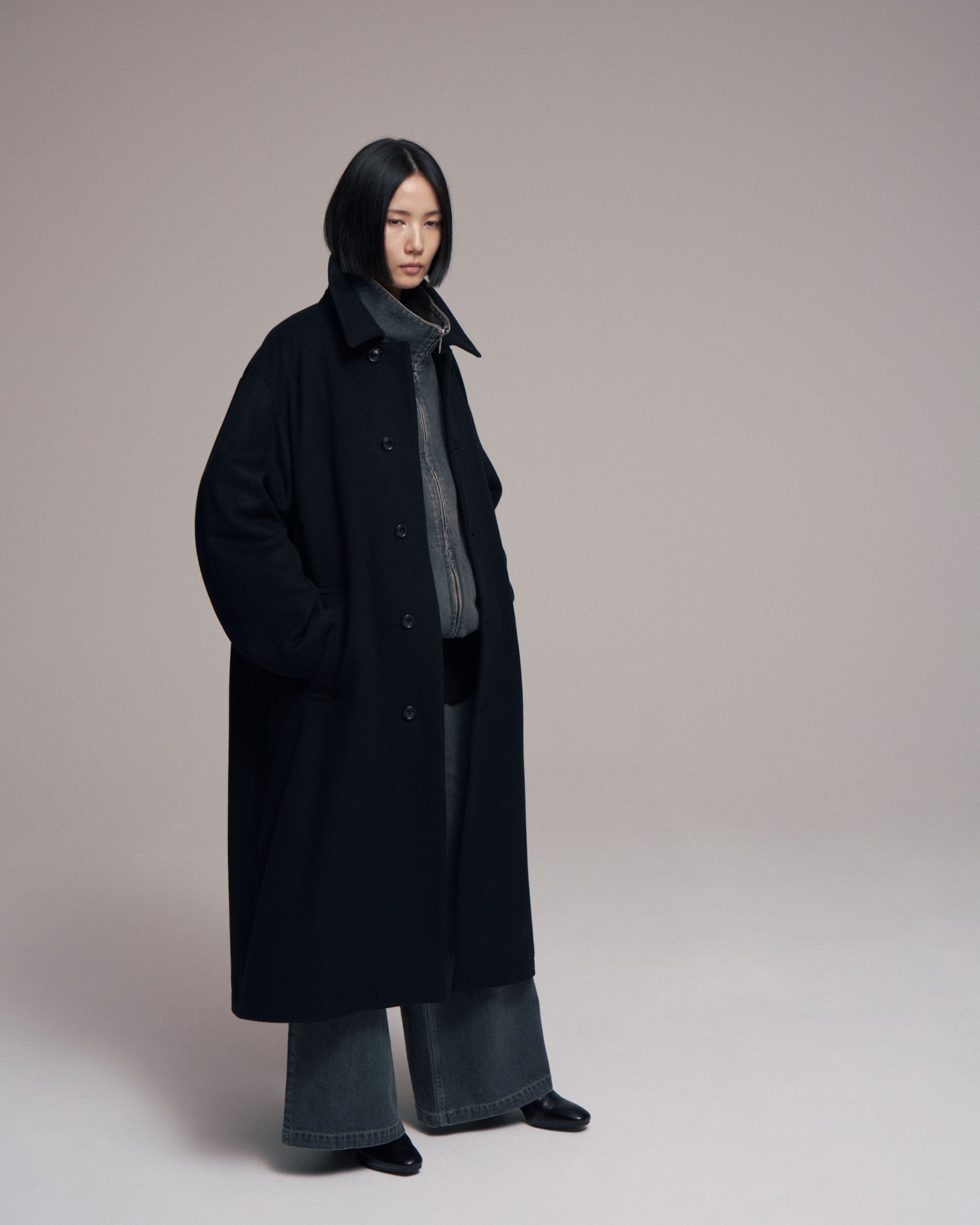 This stainless-collar coat is crafted from 100% wool melton woven with Super 100’s wool.